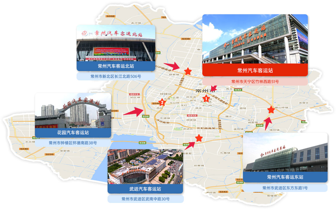 常州汽車客運(yùn)站于2010年建成,地處常州北大門,是集高鐵、地鐵、公交為一體的綜合樞紐客運(yùn)站。車站擁有11000平方米的候車、售票廳和32600平方米停車場,內(nèi)設(shè)售票窗口5個,檢票窗口30個,是常州地區(qū)最大的公路客運(yùn)站。